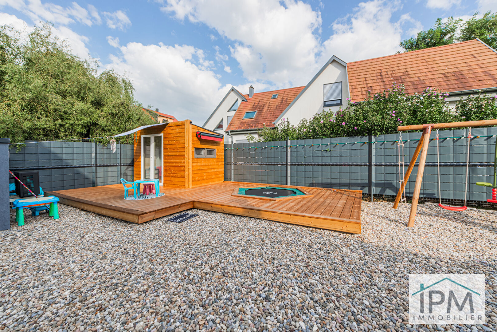 A l’extérieur, la maison dispose de plusieurs terrasses, d’une piscine creusée et son local technique. Un espace air de jeu pour les enfants a également été aménagé.