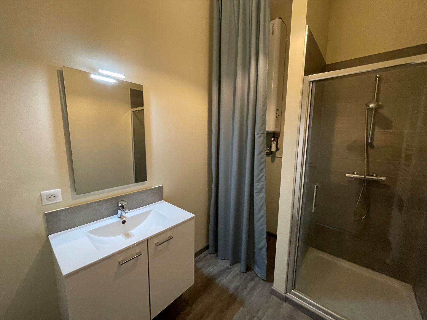 Offrant de hauts plafonds, une belle cuisine équipée ouverte sur le séjour, deux chambres , une salle d’eau, wc avec lave mains,