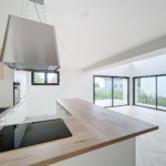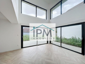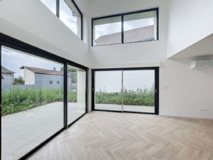 De grandes baies vitrées et une hauteur sous plafond de 5,40 M font de cette pièce très lumineuse un espace de vie très agréable donnant directement sur la terrasse et le jardin qu’il vous suffira d’arborer à votre gout.