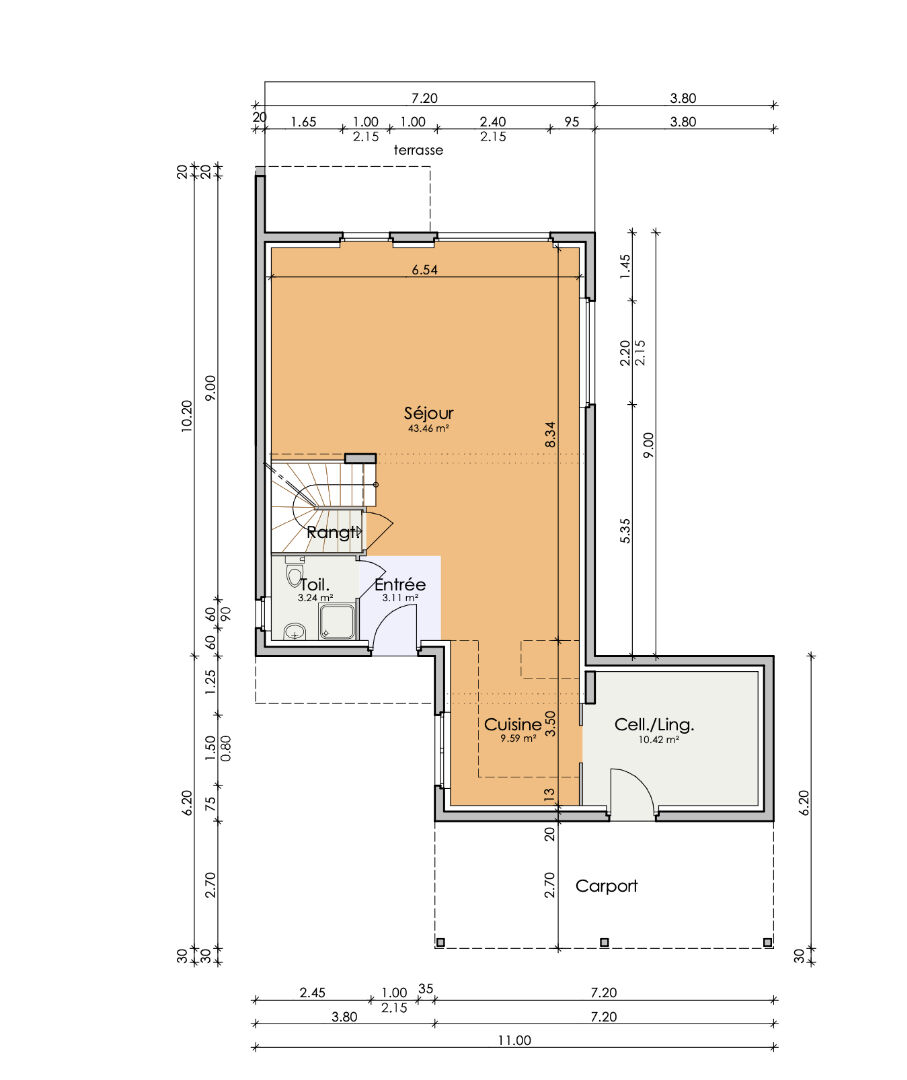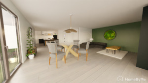 Le bien se compose d’une entrée, d’une cuisine ouverte avec cellier attenant, d’un salon-séjour de 44 m². Un espace de rangement et un WC séparé complètent ce niveau.