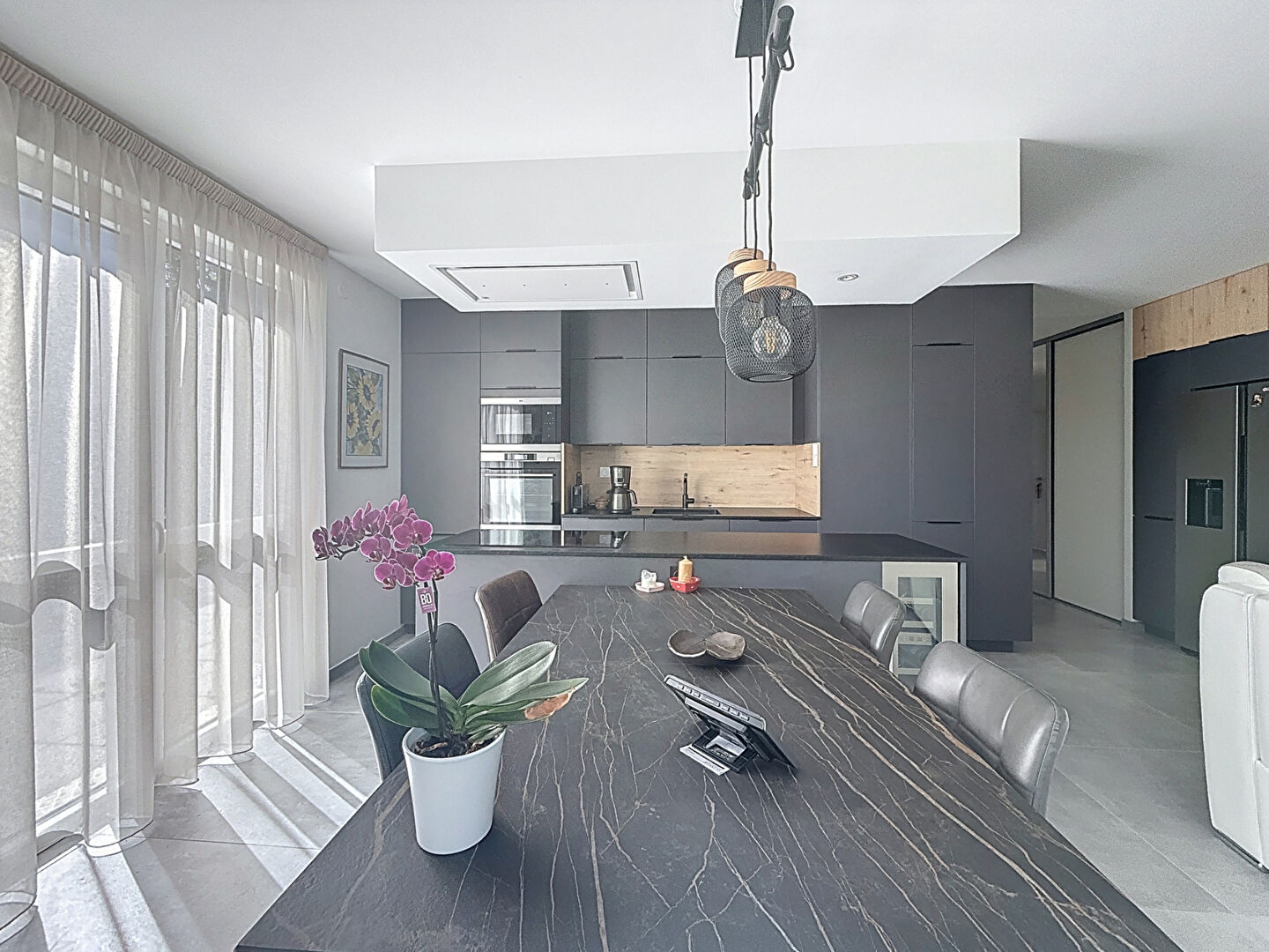 L’appartement ce compose d’une entrée avec grands placards, un dégagement menant à une pièce de vie lumineuse composée d’une cuisine ouverte et d’un salon-séjour. La cuisine est entièrement équipée, dispose de beaucoup de rangements et d’un plan de travail en granit