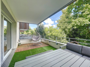 Depuis la terrasse, la vue dégagée sur un espace entièrement arboré, sans vis-à-vis, donne l’agréable impression d’être en pleine nature, tout en profitant du confort de la ville.