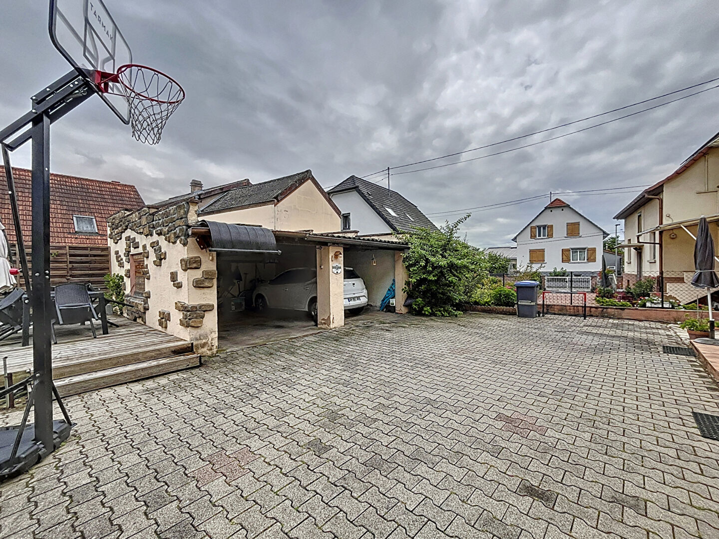 La copropriété offre de belles prestations extérieures : une terrasse , un coin de verdure ainsi qu’un bâtiment annexe accueillant deux garages, dont un est vendu avec l’appartement. La maison dispose également d’un sous-sol complet, à partager entre les deux lots, offrant ainsi une importante capacité de stockage.