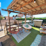 A l’extérieur : Un parking pouvant accueillir deux voitures, une cour exposée plein sud, une terrasse couverte.