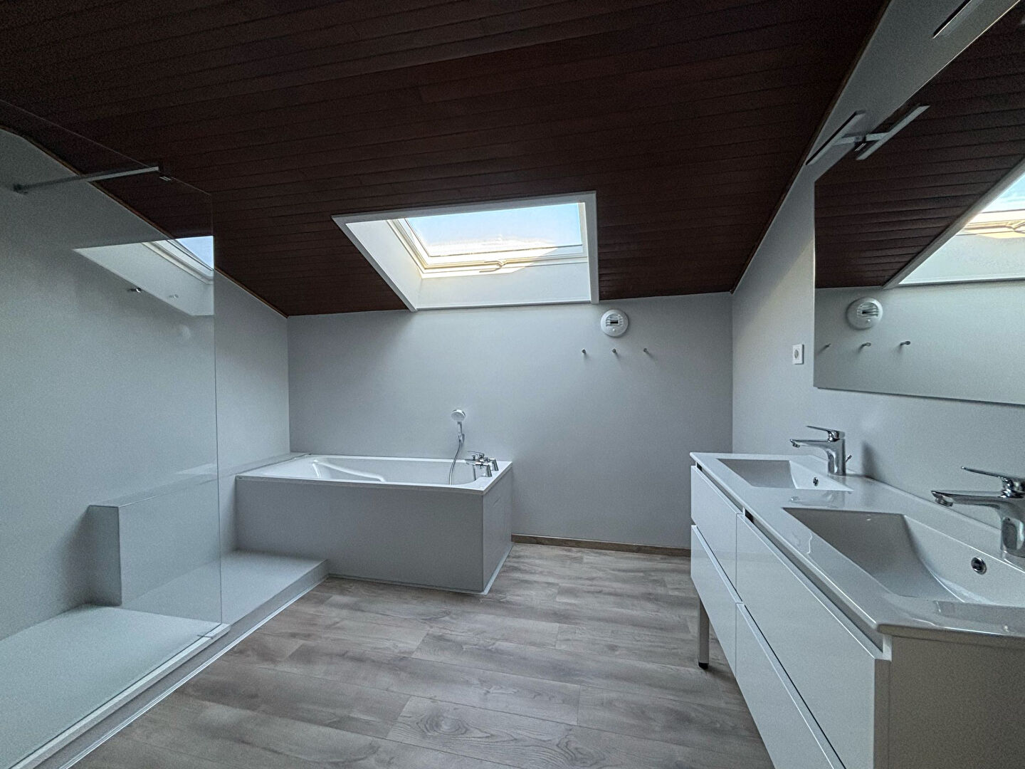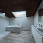 A l’étage: un grand dégagement donnant accès à deux chambres, un WC séparé et une salle de bains avec baignoire et douche.