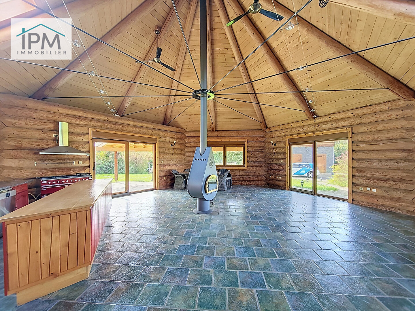Le rez-de-chaussée se compose d’une belle entrée, d’un vaste espace de vie lumineux salon-séjour, et d’une cuisine ouverte originale en forme d’hexagone, donnant directement accès au jardin et à la nature.
