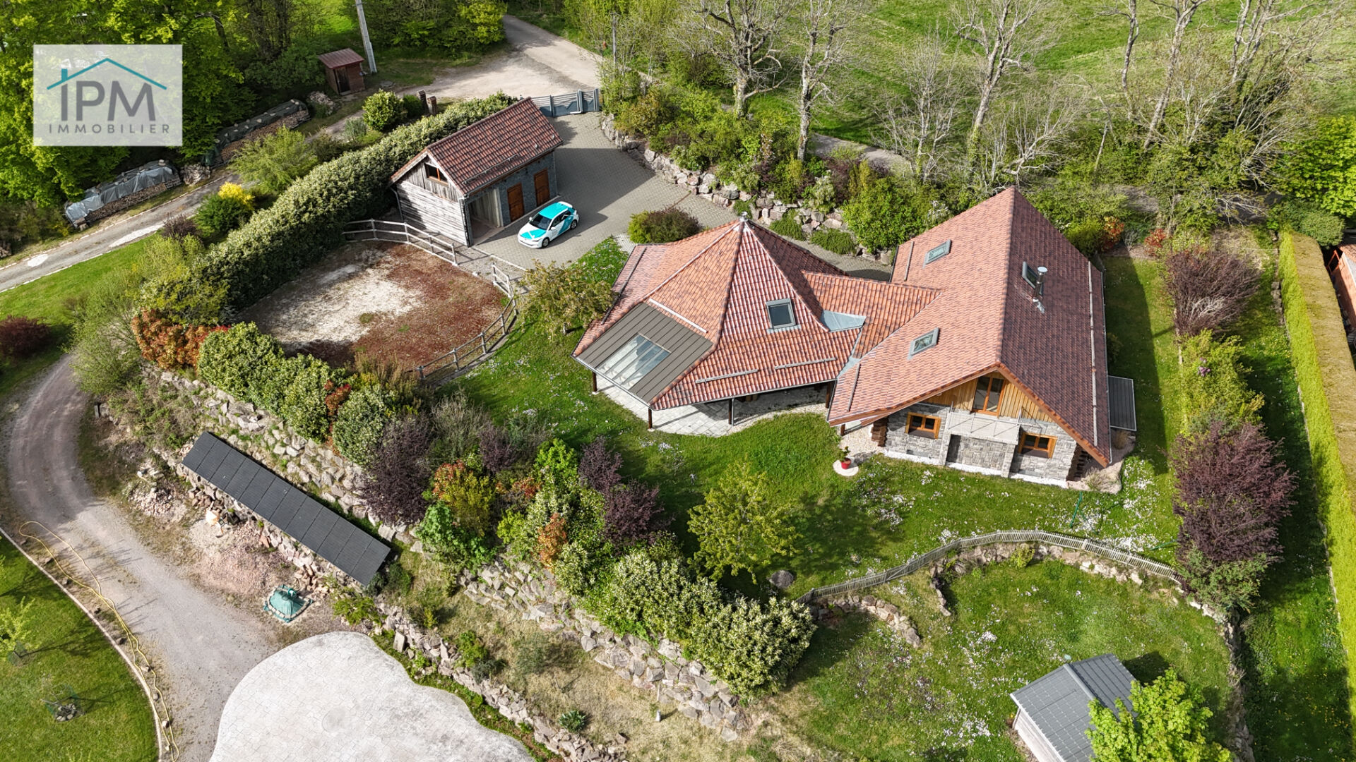 A l’extérieur, vous serez séduits par le cadre naturel, un jardin arboré, une annexe pouvant servir de garage ou de box pour chevaux, ainsi qu’une carrière équestre. Une large allée pavée mène à la maison et au garage en sous-sol.